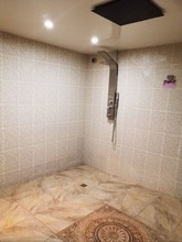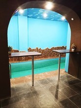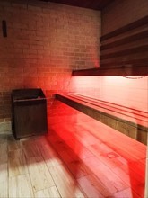 Помещение банного комплекса оформлено в современном стиле и имеет всё необходимое для комфортабельного отдыха. Вы сможете устроить полезные процедуры для тела в финской сауне с сухим паром (вместимость до 6 человек), а затем поплавать в бассейне или охладиться в душевой. У администратора можно приобрести веники и прочие банные принадлежности.